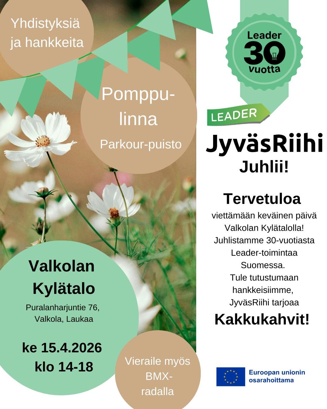 Leader-toiminta Suomessa täyttää tänä vuonna 30 vuotta. Maaseudun asukkaat, yhteisöt ja kunnat ovat kehittäneet omaa aluettaan EU:n maaseuturahoituksen tuella vuodesta 1996 lähtien. JyväsRiihi ei juhli itse pyöreitä, mutta onnittelee niitä Leader-ryhmiä, jotka aloittivat tuolloin ensimmäisten joukossa.